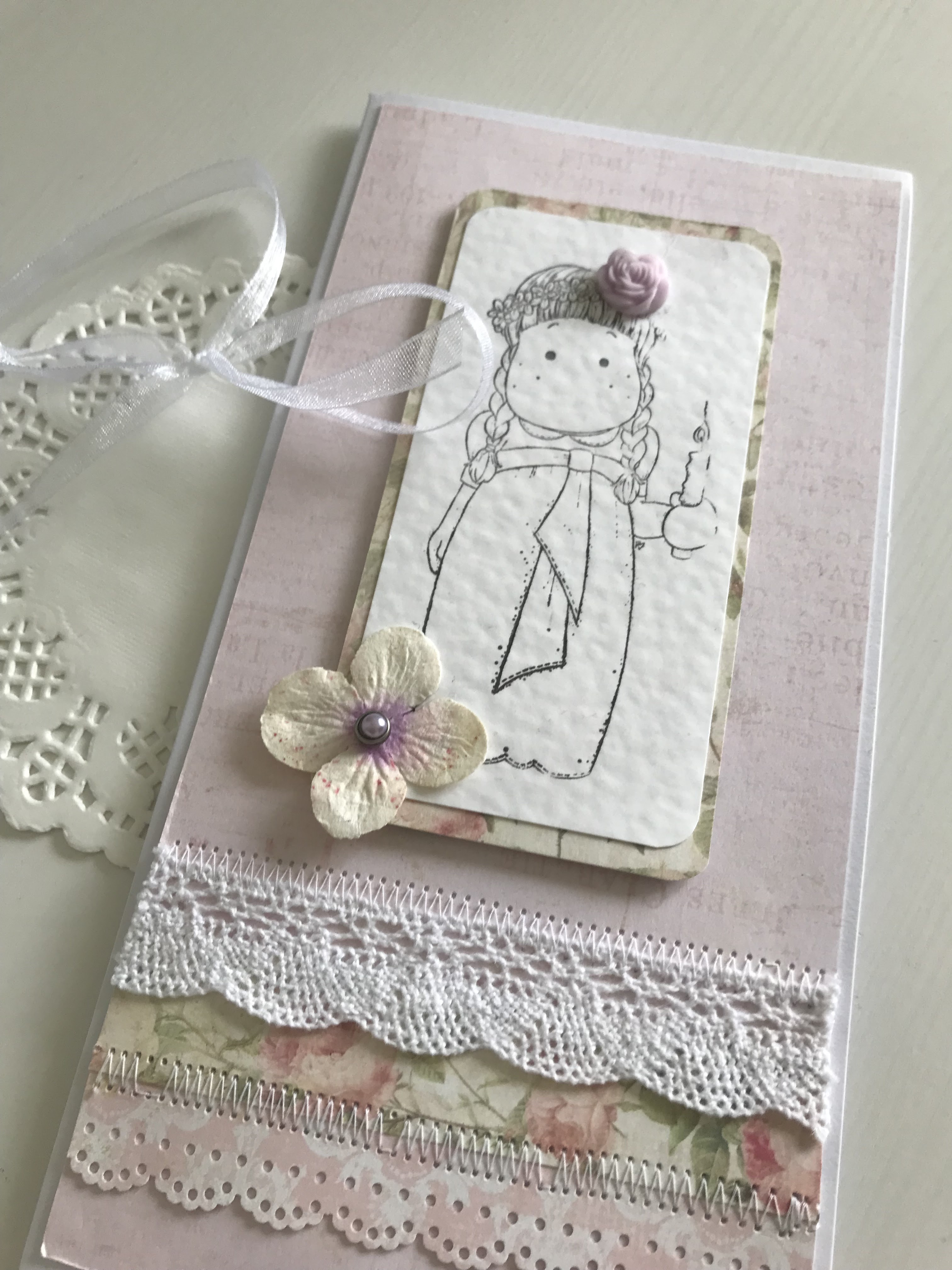 Kartki komunijne z moim ulubionym stemplem. Łączy je ów stempel i kolorystyka, a jednak każda kartka wygląda inaczej. Lubię patrzeć, jak z tych samych materiałów powstają zupełnie różne prace.